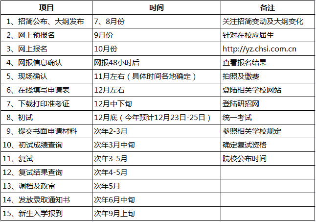 考研大纲、招生简章发布:一般来讲,每年9月初期,教育部发布当年统考公共课及统考专业课大纲,明确了相应科目的试题结构。