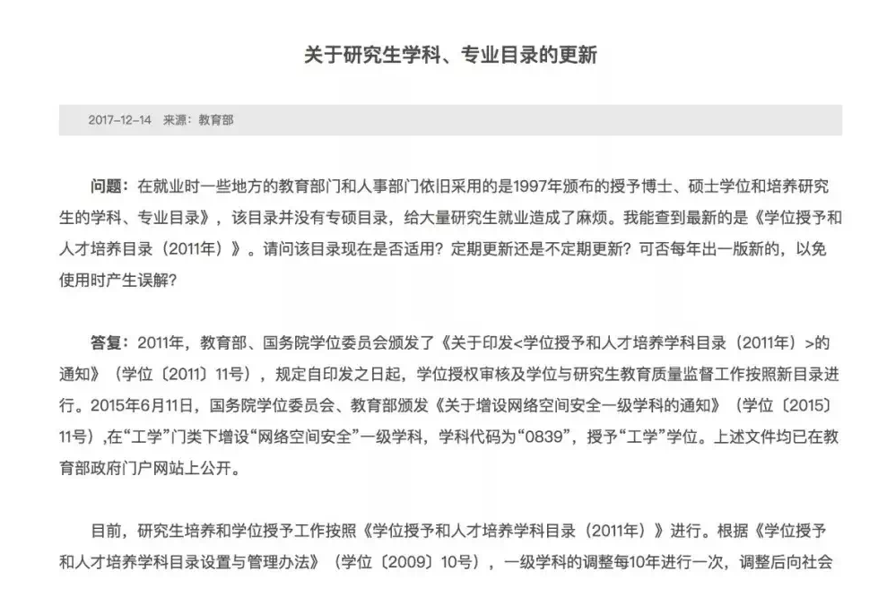 教育部关于研究生学科、专业目录更新问题的答复(来源:教育部官网截图)